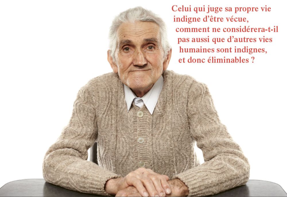 Je reviens à la corrélation entre le « fragment de continent » et l’ensemble : nul n’est une île, nul n’est isolé de la société. Le suicide n’est pas seulement l’échec d’une personne, c’est un échec pour toute la société. Que penser alors d’une société qui valide cet échec, qui l’entérine et le légalise ? Plus grave : que penser d’une société qui, non contente d’avaliser le meurtre, encadre la collaboration au meurtre ? Une société qui reconnaît un « droit » au suicide est une société qui admet que le meurtre est acceptable, ne serait-ce que sous la forme du meurtre de soi, ce qu’est exactement et littéralement le sui-cide. Quant à la collaboration au meurtre, elle revêt deux formes : l’euthanasie qui n’est pas plus une « bonne mort » que ne l’est toute autre élimination d’un innocent qui n’a pas mérité de mourir ; et l’« assistance au suicide », qui relève pratiquement de l’oxymore : se tue-t-on encore soi-même quand on se fait assister pour cela par un autre que l’on associe ainsi à l’attentat qu’on veut perpétrer contre sa propre existence ?